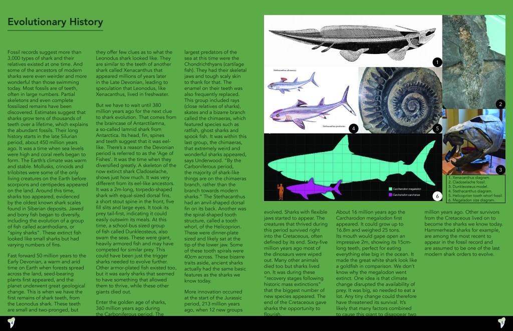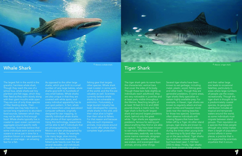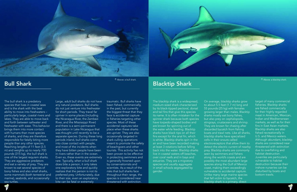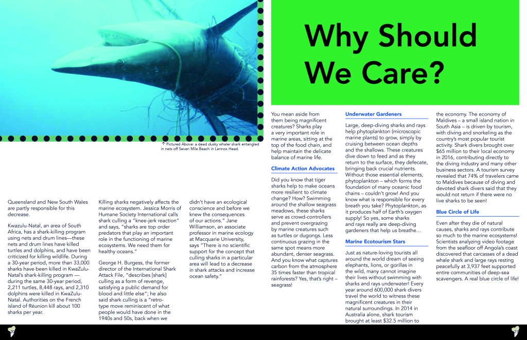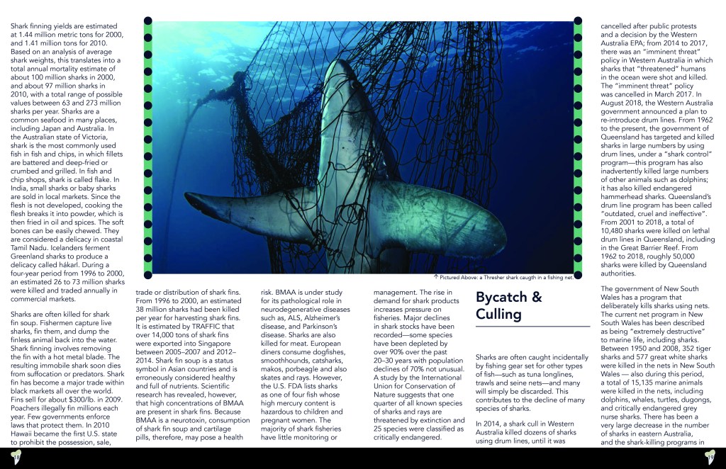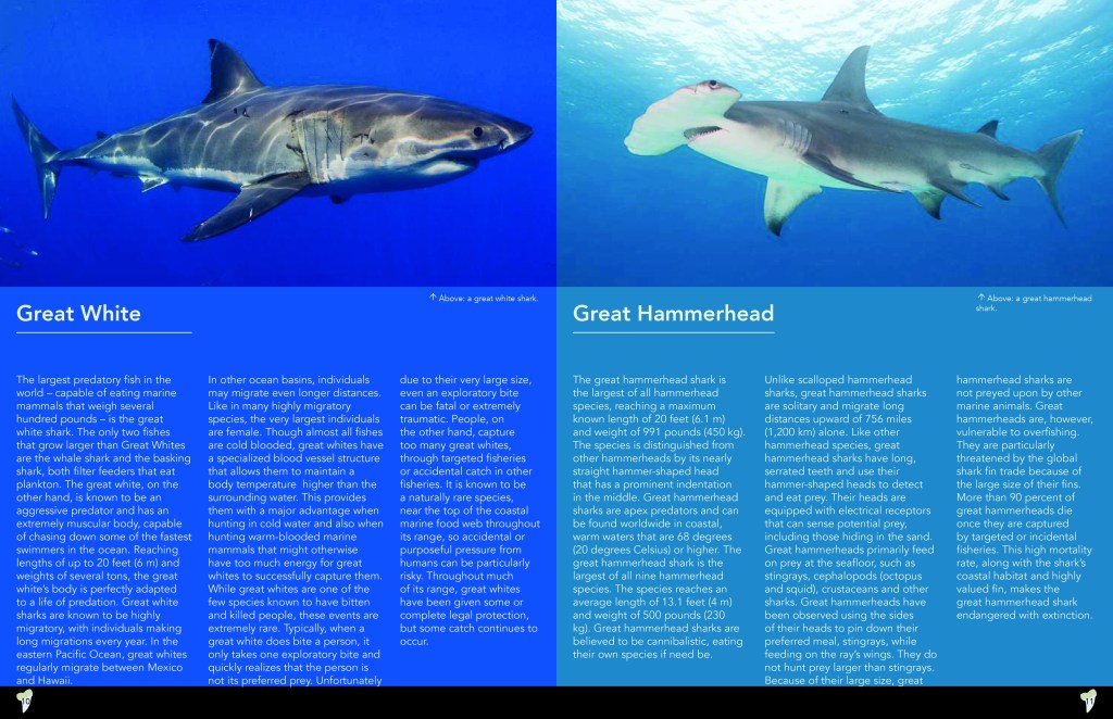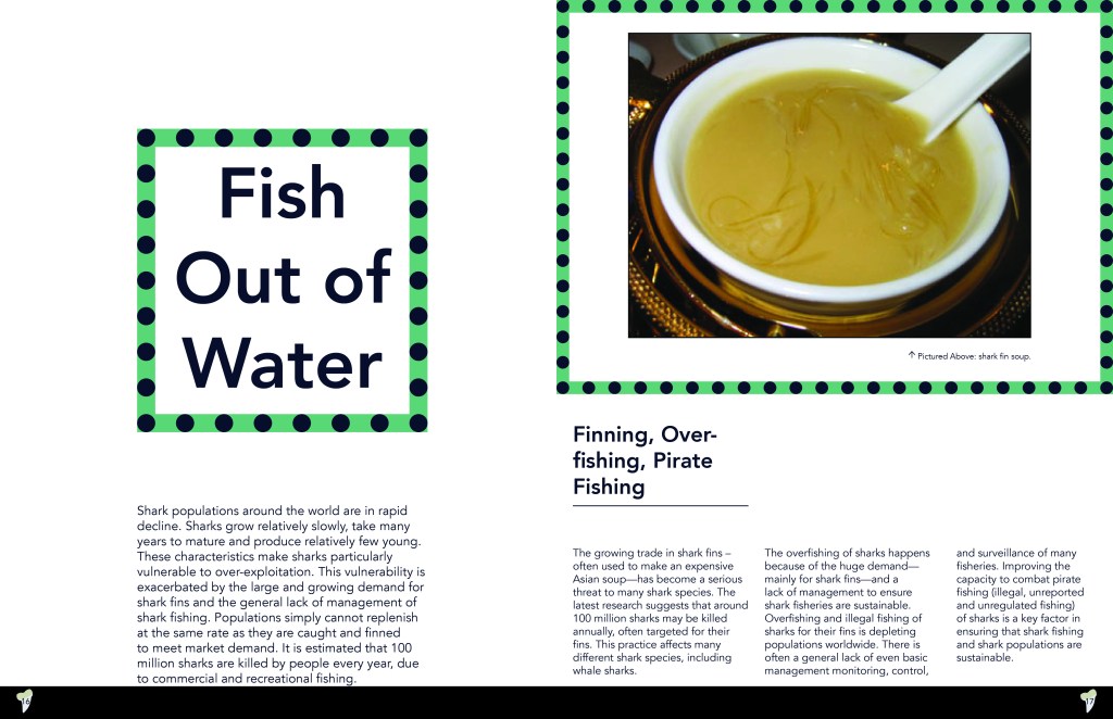 This short self-made zine is a practice in publication design. This zine was created mainly within Adobe InDesign with the exception of select elements and photos edited within Illustrator and Photoshop. The font used throughout the zine is Avenir and the color scheme is based on the photographs. The focus of this particular issue is the shark. You will read about the evolutionary history of the shark, learn about six different shark species, the multiple threats facing sharks today and what you can do to help.