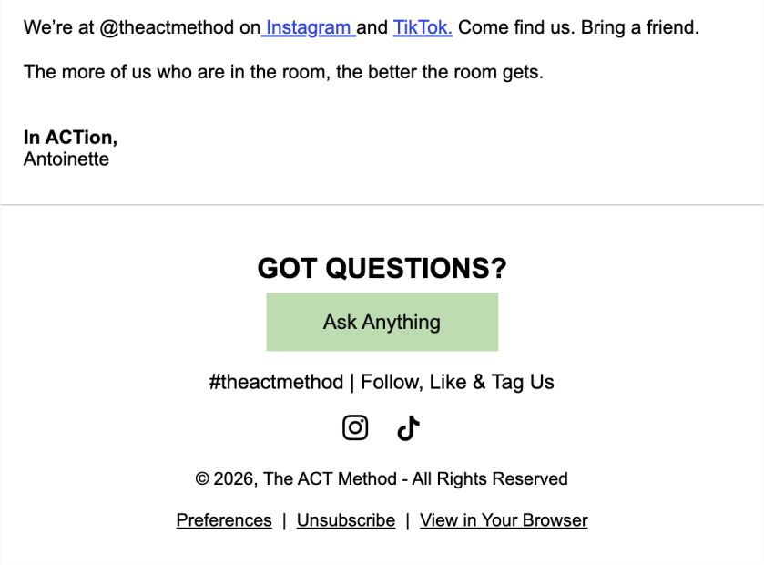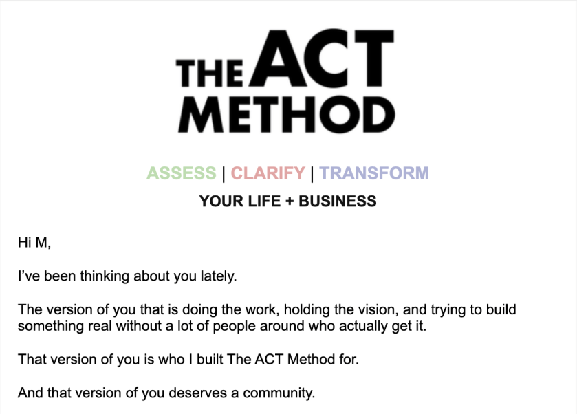 The ACT Method has its own separate Instagram page as well as a Shopify store. My part in the launch of The ACT Method involved designing the entire look and layout of the Shopify store, setting up email templates through Klaviyo, and creating inspirational graphics and reels for the Instagram page.