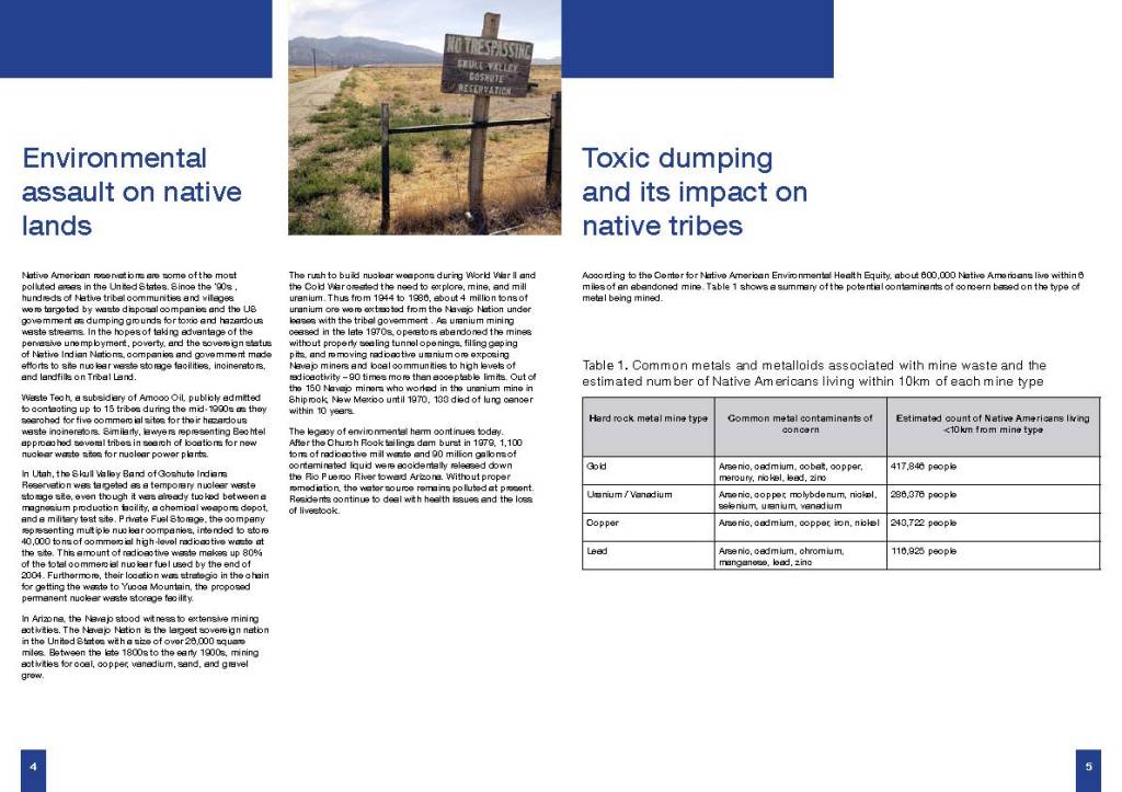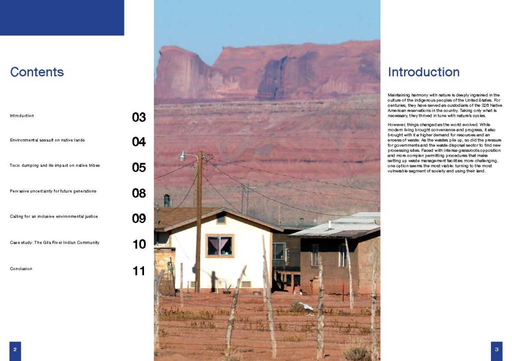 A project practicing the design of white papers—a report that informs readers about a complex issue. This 11-page white paper focuses on the environmental assault on Native American lands, particularly on toxic dumping.